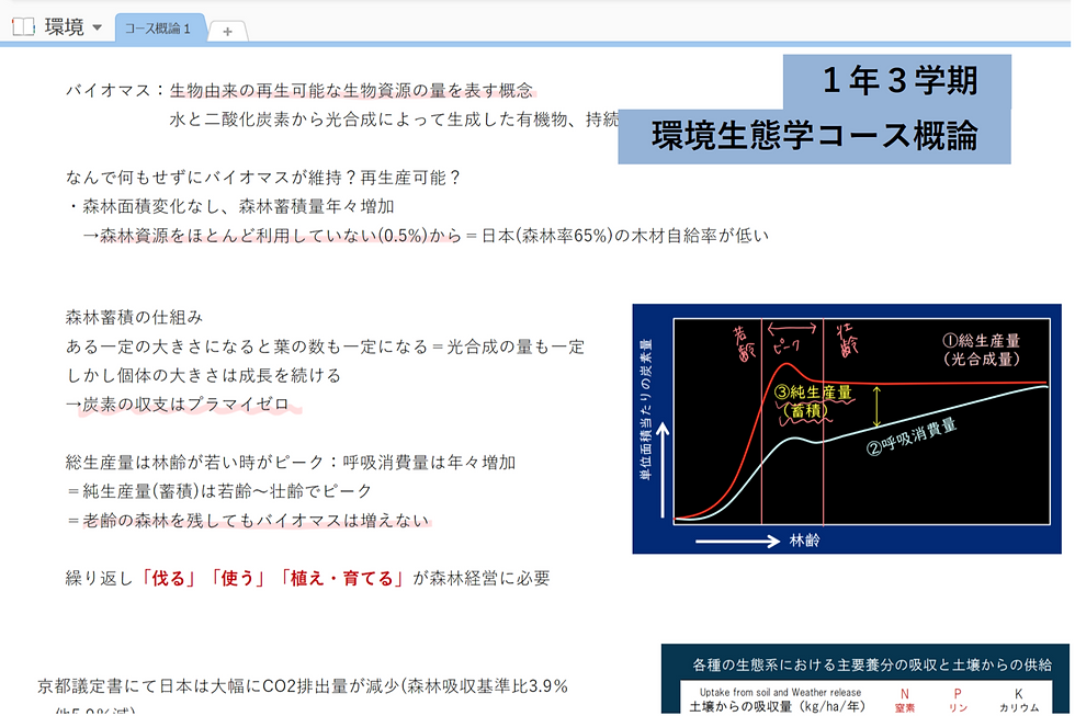 農学部は教科書を買うのではなくPDFの資料を配布してくれる先生が多いです。そんなときに印刷しなくても直接PDFに書き込みできるのがSurfaceのメリットです。OneNoteでは書き込みに加えて文字を打ち込んだりマーカーを引いたりいろいろな作業をすることができます。環境に関するデータのグラフに手書きで情報を加える、植物の模式図を手書きで書きこむなどといった作業が可能です。